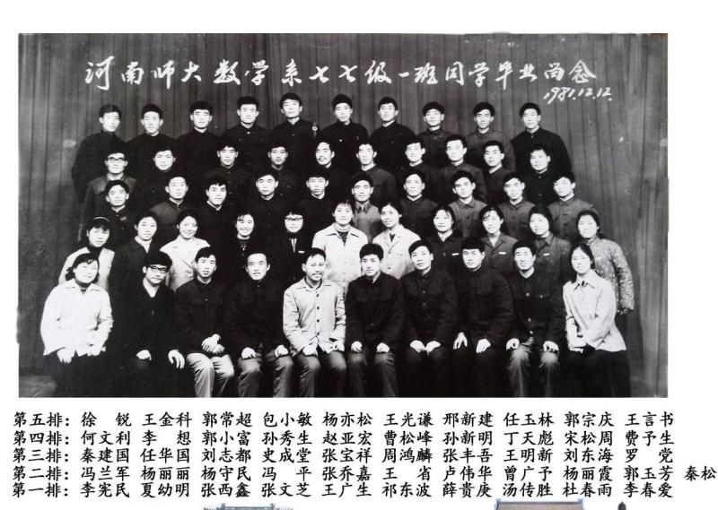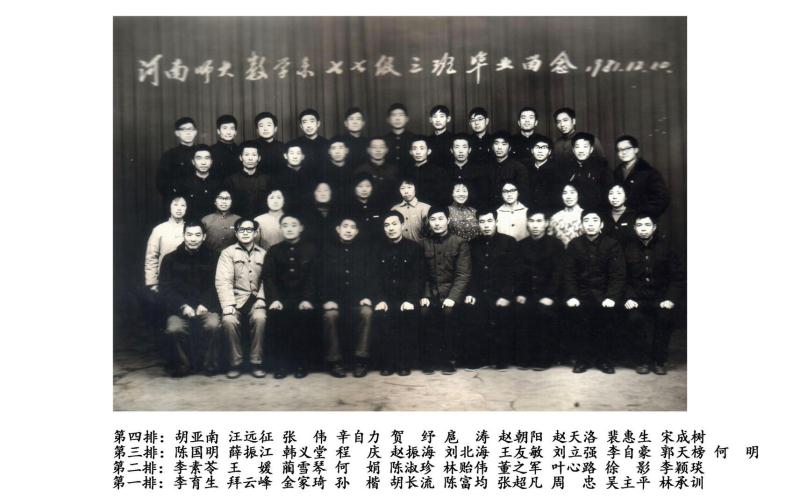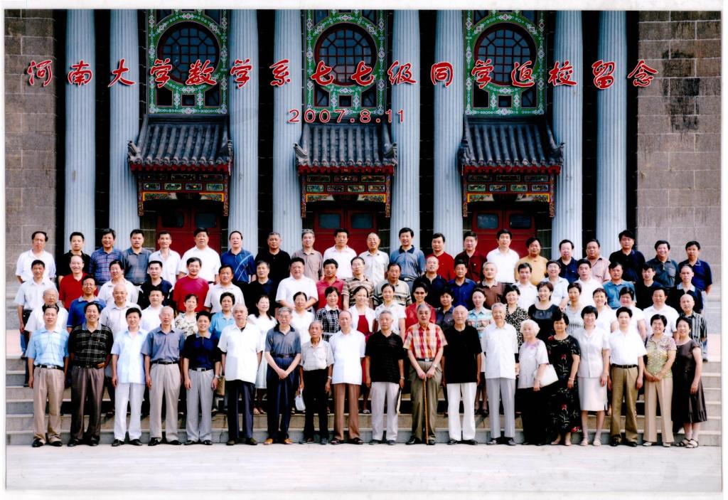转眼四十多年过去了,那些在数学系快乐学习和生活的日子早已成为永恒的记忆。值得欣慰的是,77级和数学系一直保持着亲密关系。当年留校、留系工作的同学有十几位,其中郭天榜和赵振海同学还先后担任了河南大学的校领导,更有美国纽约大学的终身教授杨亦松同学,最近十几年来,不辞劳苦往返奔波,每年都要抽出几个月的时间,在数学系默默耕耘无私奉献着,给系里培养了一大批青年学者,为我们数学专业博士点的突破和学科发展建设做出了不可或缺的贡献,他是我们77级的骄傲!