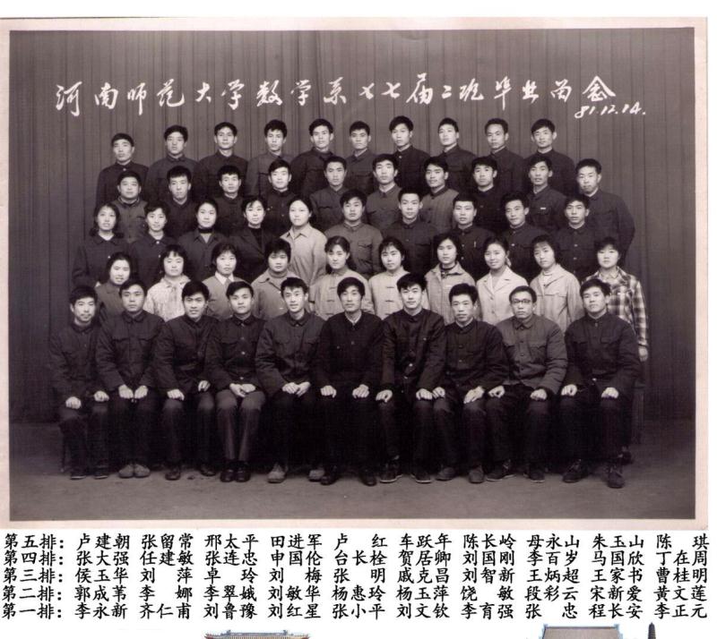 有了排名,系里开始征求意见,书记和主任亲自和每一位同学谈话。轮到我时,平时一向严肃的书记微笑着对我说:“你学习成绩很优秀,我们准备把你分配到大学工作,也可能就留在本校,你有什么意见吗?”她还告诉了我一个秘密:“四年前招生时,因为你父亲正在隔离审查,我们招不招你都符合政策,看了你的档案,知道你在农村表现不错,经研究才决定录取。”后来我才知道,负责数学系招生的还有陈顺卿主任和马国强老师,在那个讲政治的年代,能下这个决心一定很不容易。感谢开封师院,感谢数学系,在我最无助最困难的时候接纳收留了我!