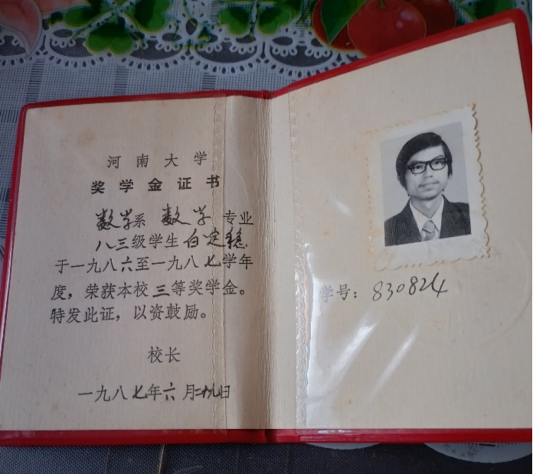 开始几年,数学系办公楼一层的108教室(后门隔大厅正对着办公楼南门)是我们的固定教室,我们在里面上课、自习 。当时我没有去“抢”前面的位置,自己坐到了靠墙的最后一排(前面是过道)紧邻后门的位置,后来可吃大亏了。由于教室前后距离远,上课听不太清、看不太清,一不留神就错过了老师的讲解,不少时候得自学。可是当时也没有什么参考书,只看课本总是不如听老师讲。特别是刚开学学习数学分析课,主讲的徐根固老师是外地口音,我听得就更不好了,加上自己有些大意,第一次小考,竟只得了47分!感觉很丢人,闷闷不乐。王性玉老师那天到班听课,坐到我身边,亲切地对我说:我看了你的高考数学成绩,103分,很好啊!怎么这次考这么差?……想不到王老师竟这么关心我,我羞愧地低下头,暗暗地下决心:一定不辜负王老师的特别关心和期望!之后,我振作精神,课堂上尽力听讲,课下认真自学,再不敢大意,结业考试得了76分,虽然只是中等水平,但总算长出了一口气!接下来的各门课程学习,我都提醒自己接受教训,不辜负老师的培育之恩,各门考试成绩再没低于80分,有不少门还在90分以上。有一次在年级组织的数学竞赛中获得“三等奖”,最后一学年得了河大“三等奖学金”(证书至今珍藏着),大学四年总成绩排在年级前三十名。(突然发现我和“三”特别有缘!我还曾在系团总支组织的一次演讲比赛中获“三等奖”,曾在学校团委组织的一次征文比赛中以一篇《家乡的绿》获“三等奖”(数学系唯一的获奖者))。大学四年,虽然我比不上那些学习拔尖的同学,但我可以说:我也努力了,没有虚度年华!